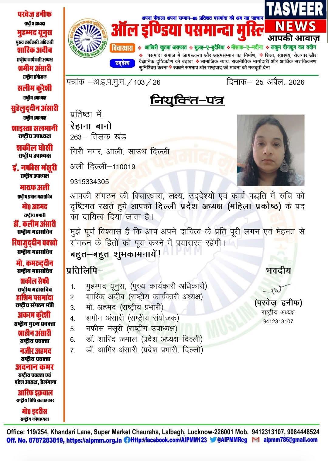 दिल्ली से एक अहम खबर सामने आ रही है, जहाँ रिहाना सिद्दीकी को ऑल इंडिया पसमांदा मुस्लिम महाज़ की महिला विंग, दिल्ली का अध्यक्ष नियुक्त [more…]