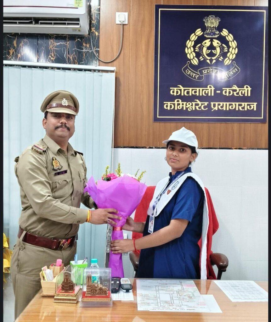 महिलाओं की सुरक्षा, सम्मान और स्वावलंबन को बढ़ावा देने के उद्देश्य से चलाए जा रहे मिशन शक्ति 5.0 के तहत स्ट. मैरी कॉन्वेंट इंटर कॉलेज की कक्षा 9 की छात्रा ज्ञाना दुबे को करैली थाना, प्रयागराज का एक दिन का कोतवाल बनाया गया। इस अवसर पर थाना प्रभारी आशीष सिंह, वरिष्ठ उपनिरीक्षक दिनेश शुक्ला, महिला उपनिरीक्षक मंजू शाक्य और उपनिरीक्षक प्रिया यादव ने उनका फूलों के बुके से स्वागत किया।